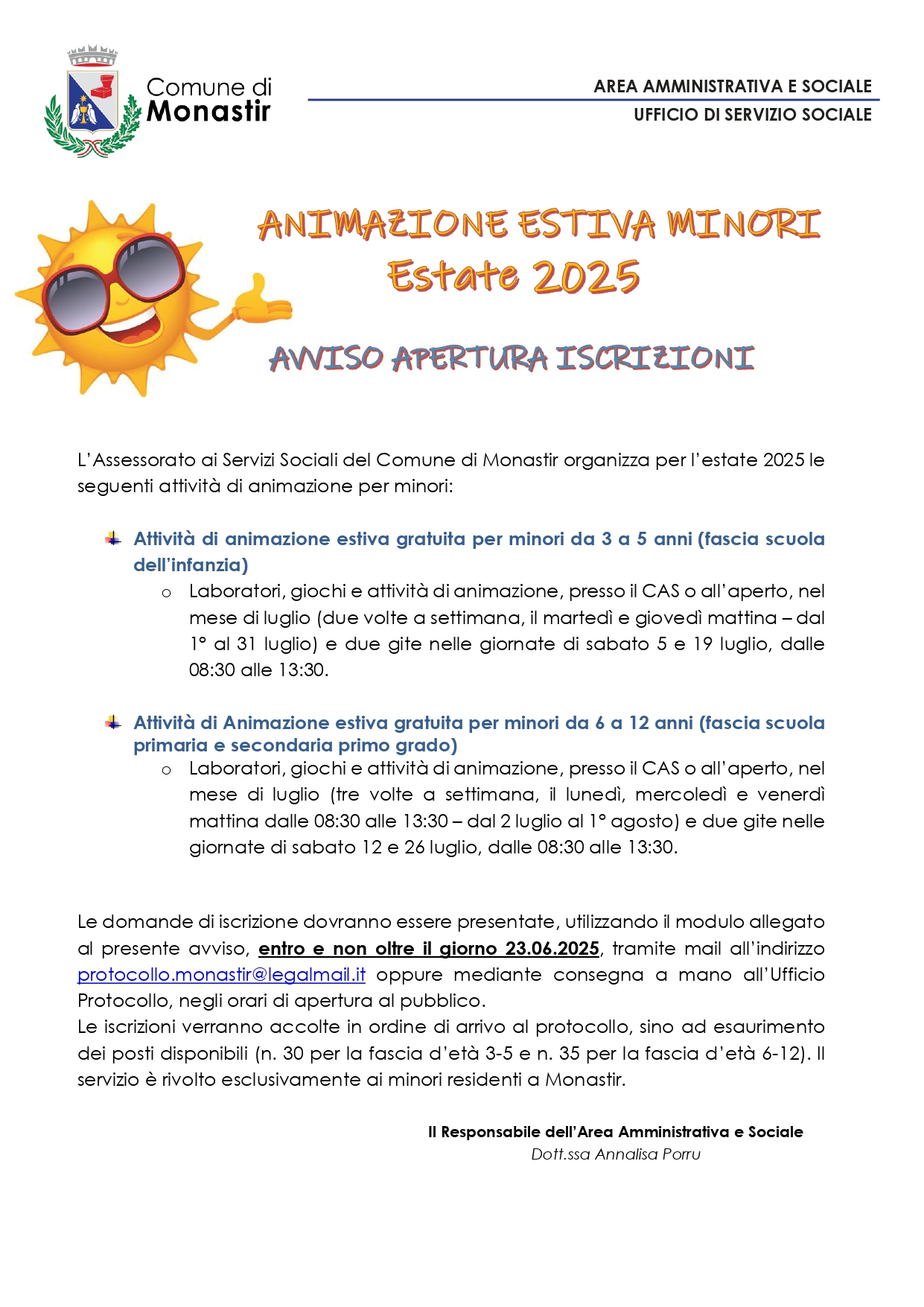 Le domande di iscrizione dovranno essere presentate, utilizzando il modulo allegato al presente avviso, entro e non oltre il giorno 23.06.2025, tramite mail all’indirizzo protocollo.monastir@legalmail.it oppure mediante consegna a mano all’Ufficio Protocollo, negli orari di apertura al pubblico.
