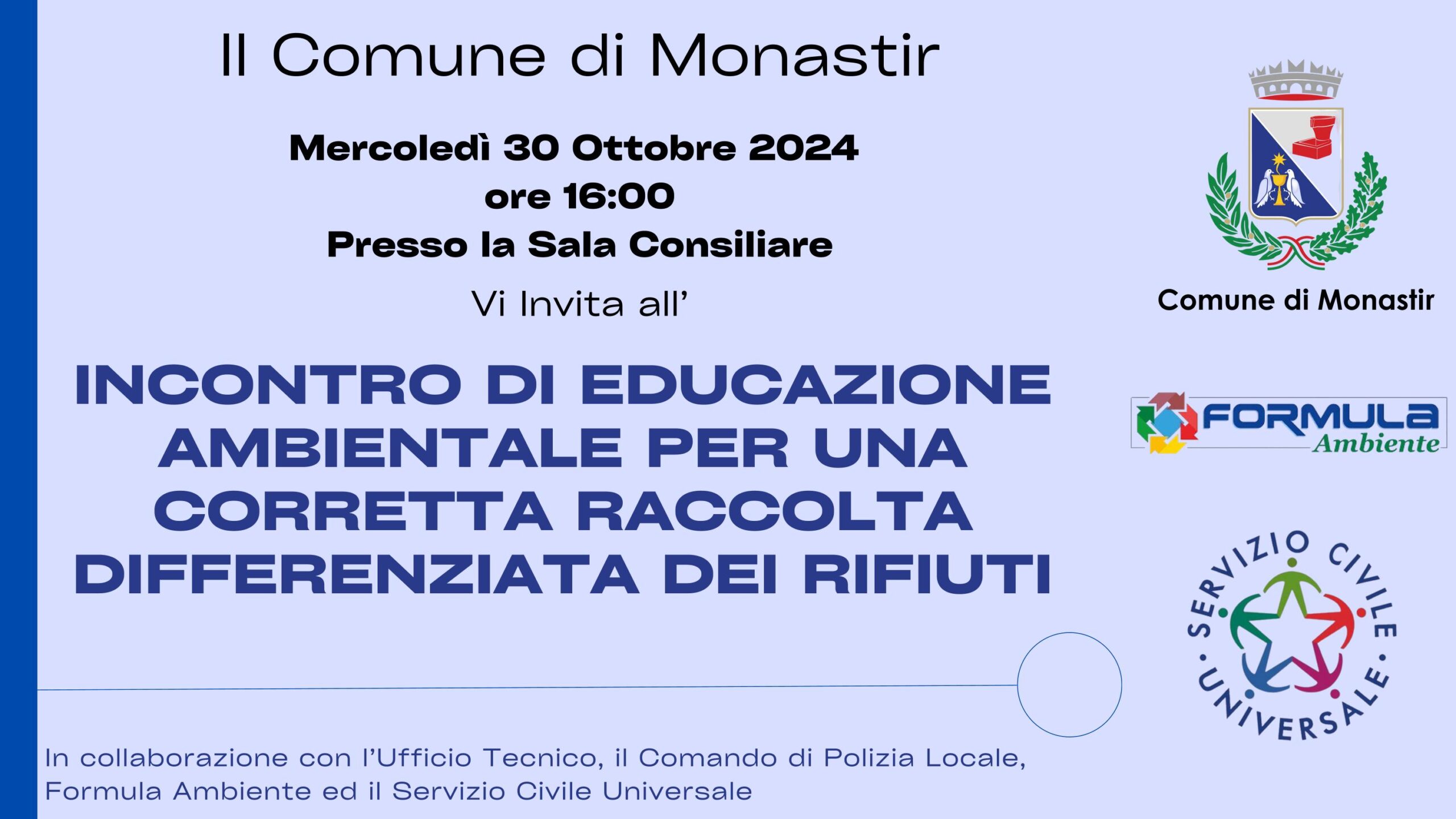 Incontro di educazione ambientale per una corretta raccolta differenziata dei rifiuti per tutti i cittadini di Monastir in collaborazione con l’Ufficio Tecnico, Comando di Polizia Locale ,Formula Ambiente ed il Servizio Civile Universale