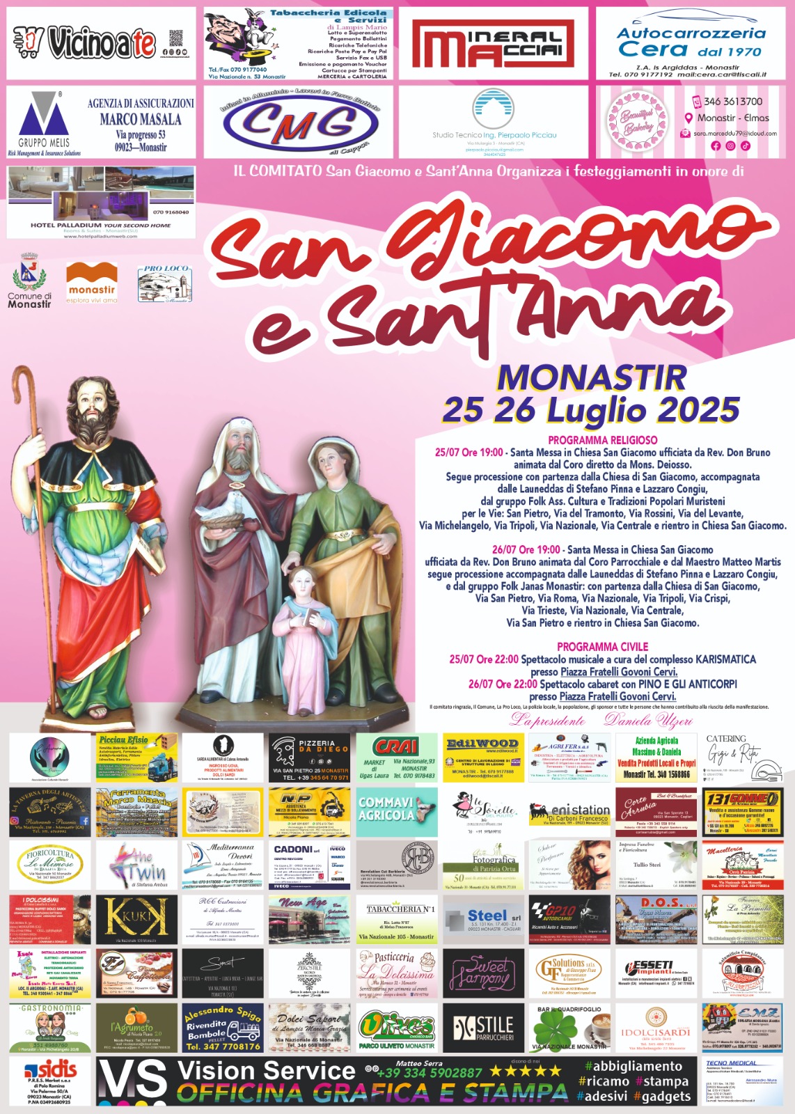 Il Comitato dell'Associazione Culturale San Giacomo e Sant'Anna, con il patrocinio gratuito del Comune di Monastir e la collaborazione della Pro Loco, organizza i festeggiamenti in onore di San Giacomo e Sant'Anna, che si terranno dal 25 al 26 Luglio 2025.