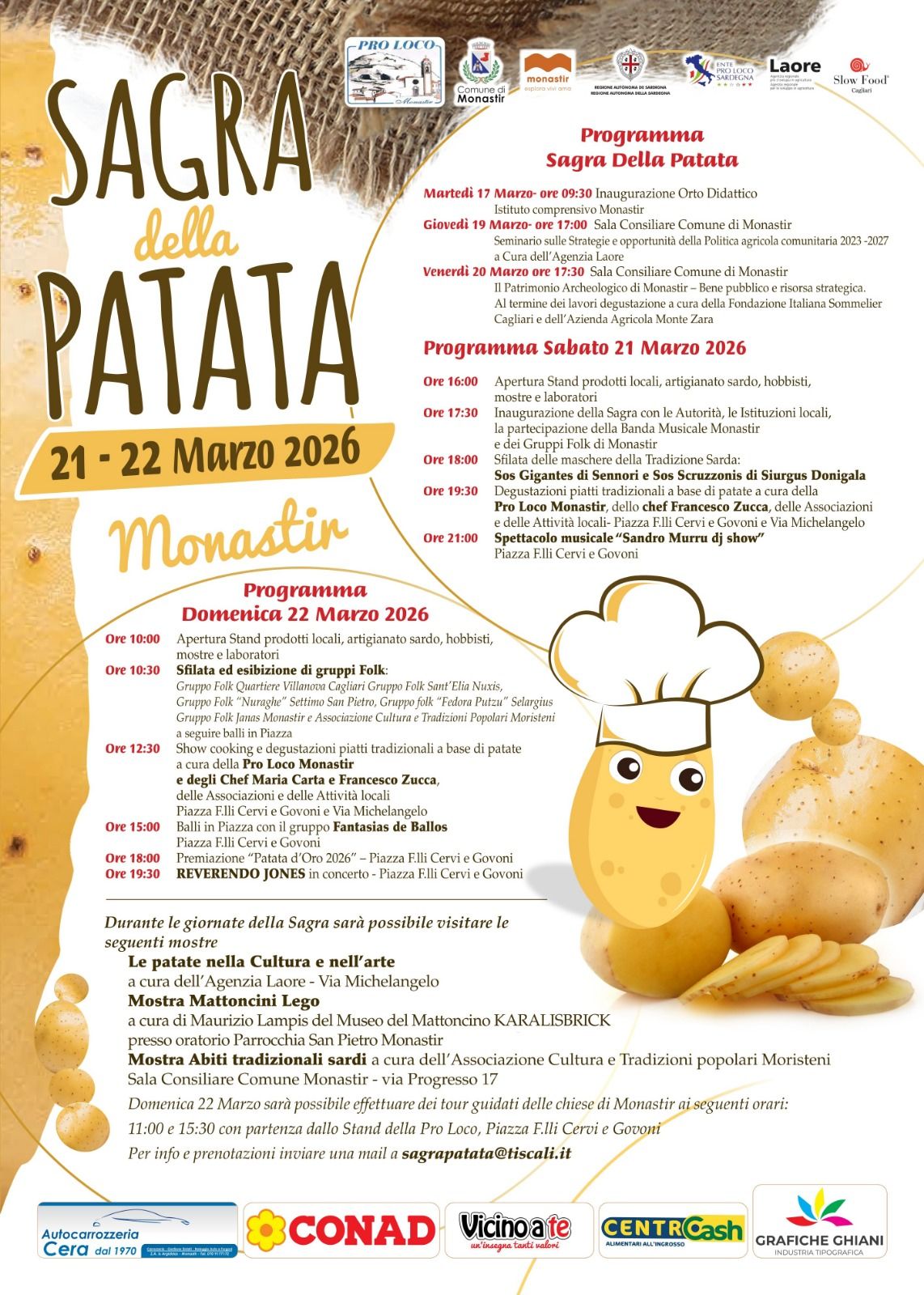 La Pro Loco di Monastir, con il patrocinio gratuito del Comune di Monastir, organizza la Sagra della Patata che si terrà nei giorni 21 e 22 marzo 2026.